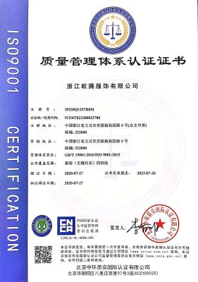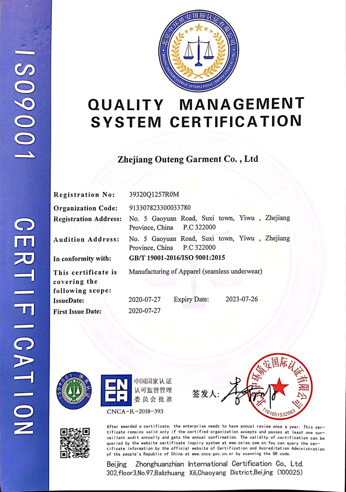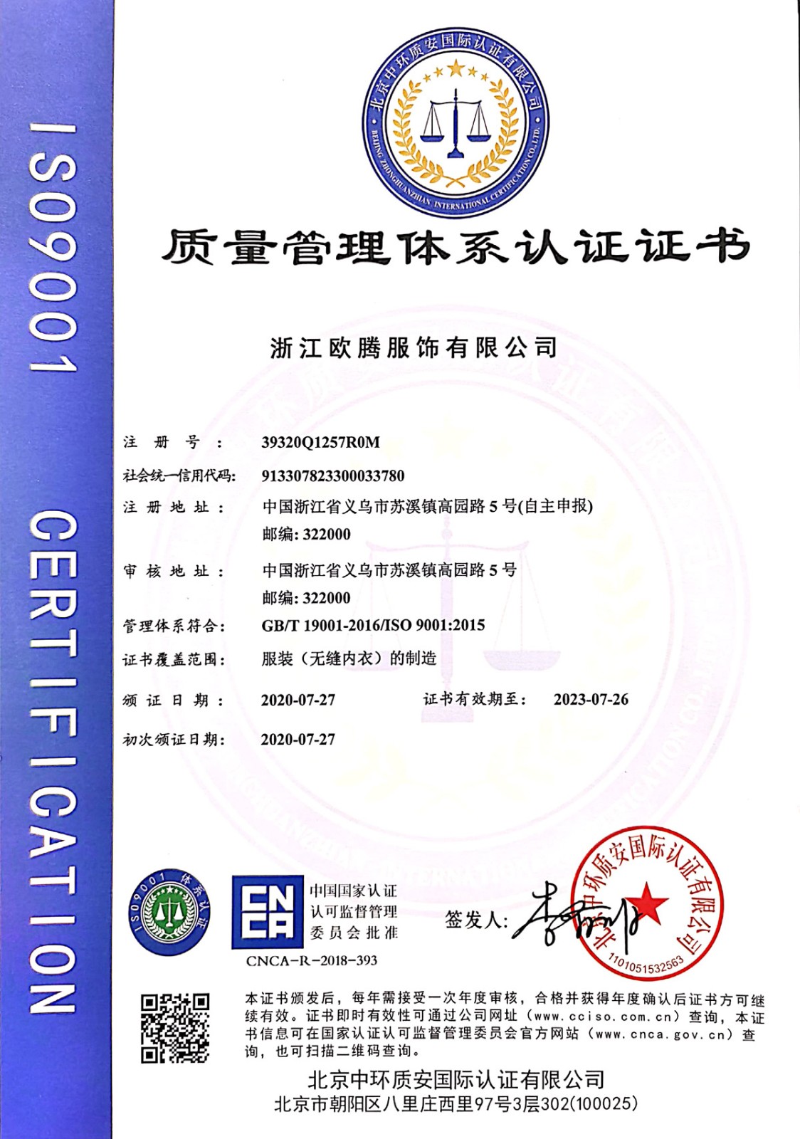 浙江歐騰服飾有限公司位于世界小商品之都-義烏。創(chuàng)立于2015年,是一家專業(yè)生產(chǎn)無縫針織運(yùn)動服飾和內(nèi)衣的工貿(mào)一體企業(yè),擁有自主出口權(quán)。 工廠的占地面積約16000平方米 ,引進(jìn)了大型圣東尼、高騰等多種先進(jìn)的制衣設(shè)備300余臺。月產(chǎn)能可達(dá)90萬件。 歐騰服飾每年投入近百萬資金打樣開發(fā)新產(chǎn)品,有著一支高素質(zhì)設(shè)計、技術(shù)員工隊伍。工廠先后通過了ISO 9001質(zhì)量管理體系認(rèn)證、BSCI認(rèn)證、GRS認(rèn)證、OEKO-TEX國際生態(tài)紡織品認(rèn)證等多項(xiàng)專利檢測報告。可提供OEM&ODM服務(wù)。歐騰服飾以一套完整、科學(xué)的質(zhì)量管理體系,生產(chǎn)的服裝從原材料紗線到成衣,質(zhì)量完全能夠滿足國內(nèi)、國際質(zhì)量要求。獲得了客戶一致好評。工廠先后獲得省科技型企業(yè)、國家高新企業(yè)、義烏市誠信講信用單位、規(guī)上企業(yè)、信用AAA級等榮譽(yù)。